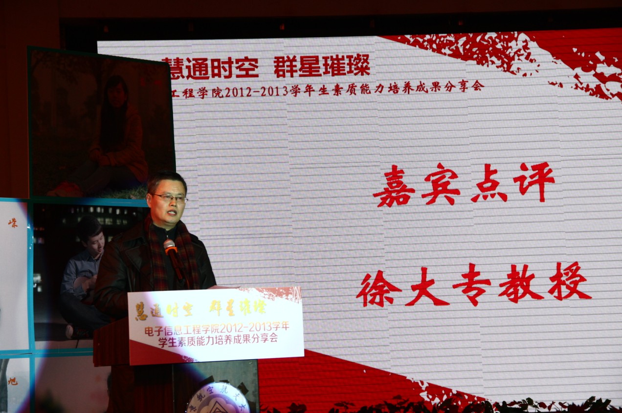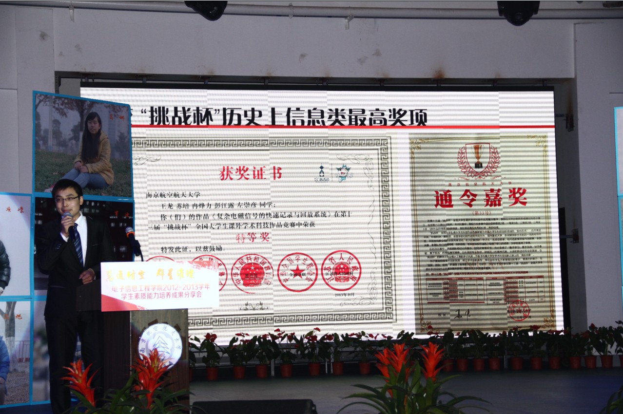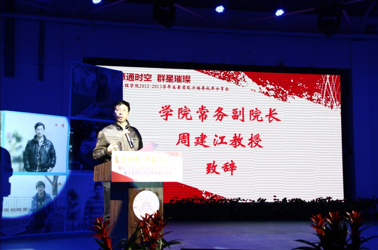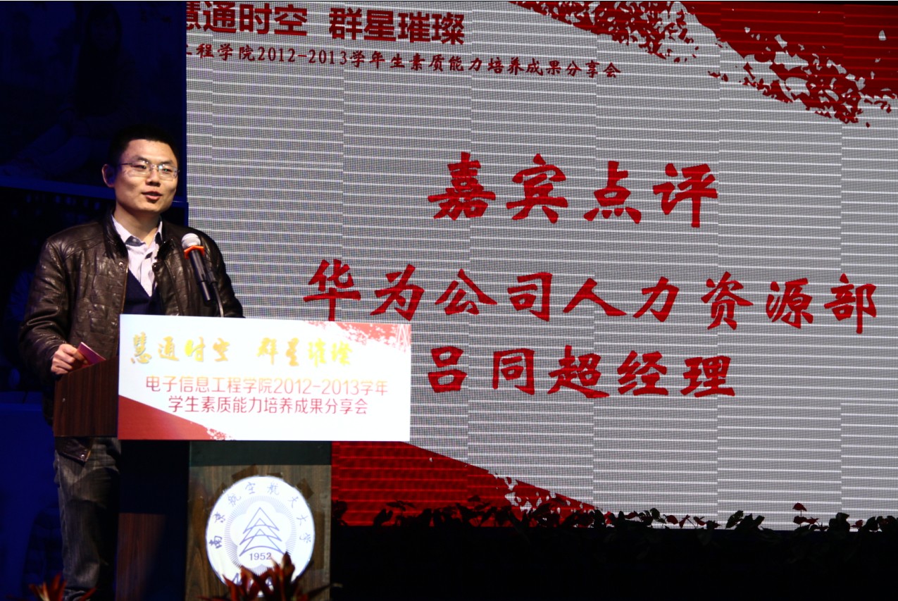 2013年12月11日晚,久久小说 “慧通时空,群星璀璨”2012-2013学年学生素质能力培养成果分享会在江宁校区大学生活动中心隆重举行。出席本次活动的主要嘉宾有:教务处处长王成华、校团委书记侍旭、华为南研所人力资源部招聘经理吕同超、学院党委书记冯绍红、常务副院长周建江、党委副书记季海群,副院长赵永久、刘少斌、张弓,参与此次活动的还有班主任、辅导员及近七百名本科生。