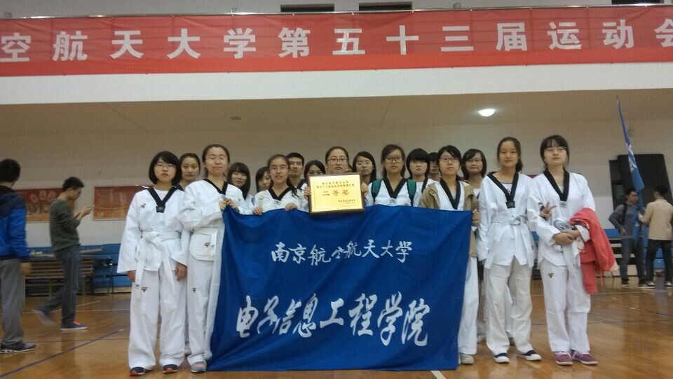 2014年11月1日上午9:00,南京航空航天大学第五十三届运动会跆拳道比赛在体育中心篮球馆开赛!全校16个院共16支代表队参加了本次比赛,最终,我院代表队凭借稳健而出色的表现,斩获二等奖。