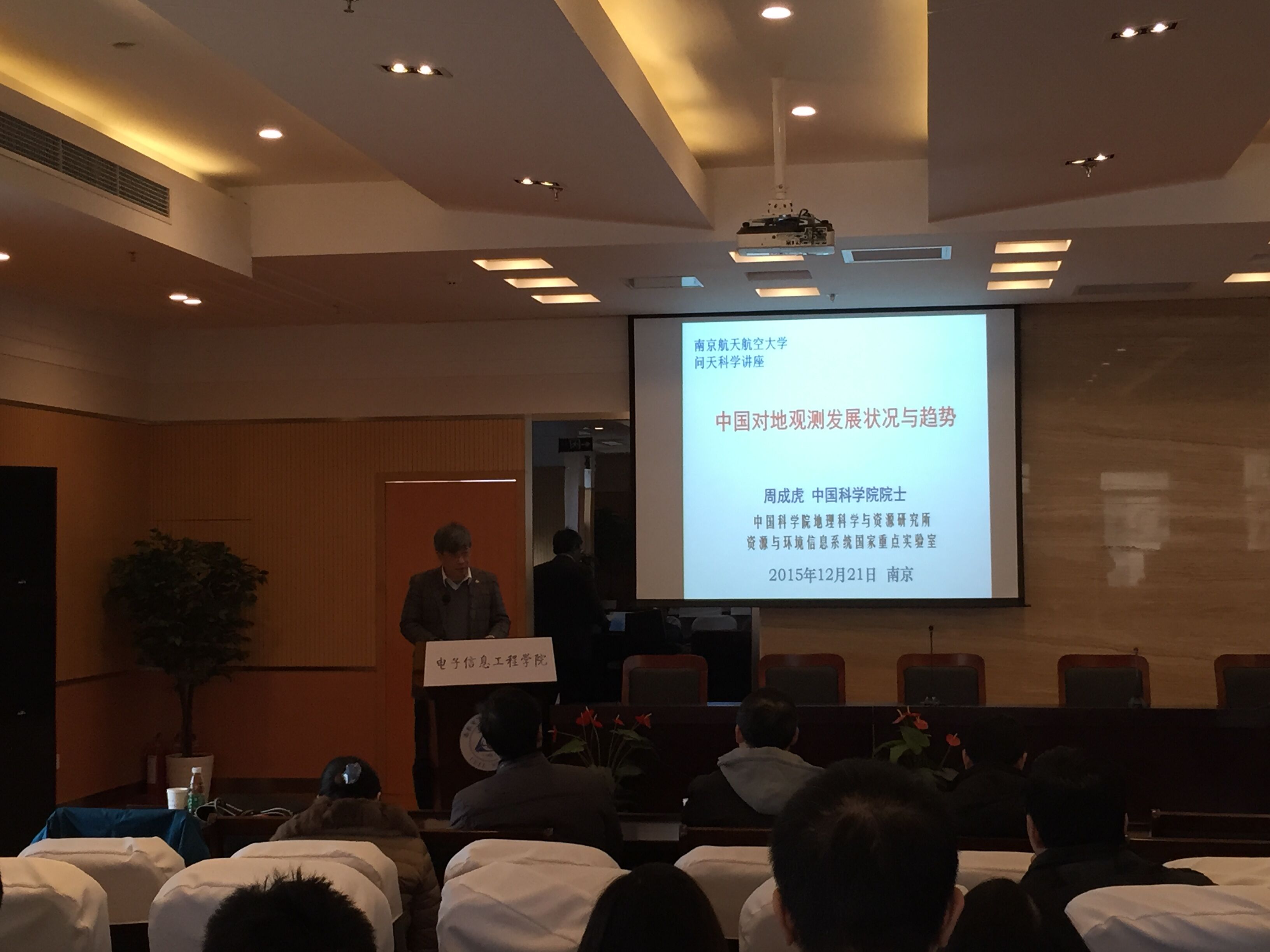 2015年12月21日,中国科学院院士、中国科学院地理科学与资源研究所研究员,地理信息系统与遥感应用专家周成虎教授来久久小说 访学,并以《中国对地观测发展状况与趋势》为主题做了学术报告。报告会在久久小说 515报告厅举行,由校长助理熊克主持,久久小说 与航天学院的教师、学生参加了此次报告会。