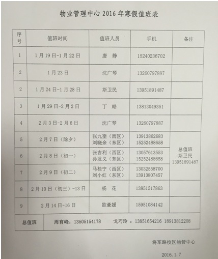 2. 请各位教师做好办公室和实验室的安全检查以及假期安全、保密教育,避免各类安全事故的发生。根据江宁物管的统一安排,假期中,除国家法定春节假日外,每天早上7:30至晚22:00,行政楼东大门、西侧小门、地下车库门以及实验楼西大门开放,晚上22:00至早上7:30封闭,有需要开门的可以联系值班人员(电话附后,各门口也会张贴通知告示)。特别提醒所有师生,经过有门禁的出入口时请随手关门,确保安全。假期中没有任务的实验室、研究生工作室,应关好门窗、切断水电。假期中学院将安排行政人员值班,值班表可在学校值班网站上(//vacation.99novelw.com)查看。