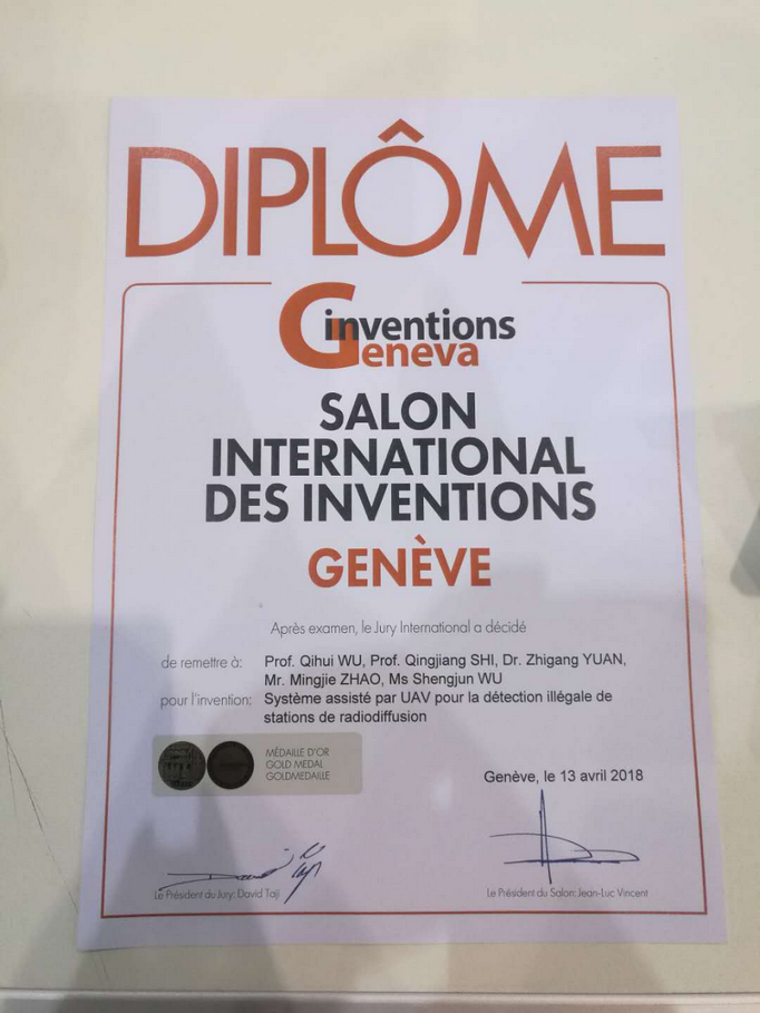 第46届日内瓦国际发明展于2018年4月11日至4月15日在瑞士日内瓦Palexpo会展中心举行,由久久小说 久久小说 参展的“UAV-Assisted System for Illegal Broadcasting Station Detection(基于无人机平台的非法广播电台搜索定位系统)”斩获金奖。该成果由长江学者吴启晖教授、史清江教授、袁志刚与黄洋副教授、戚楠讲师带领赵明杰、吴盛君、管鑫硕士、胡田钰本科生等人共同完成。
