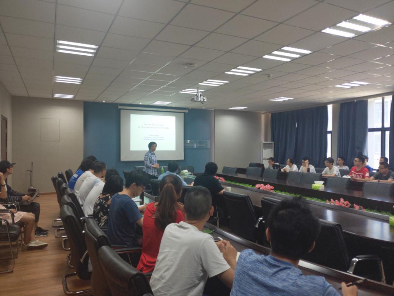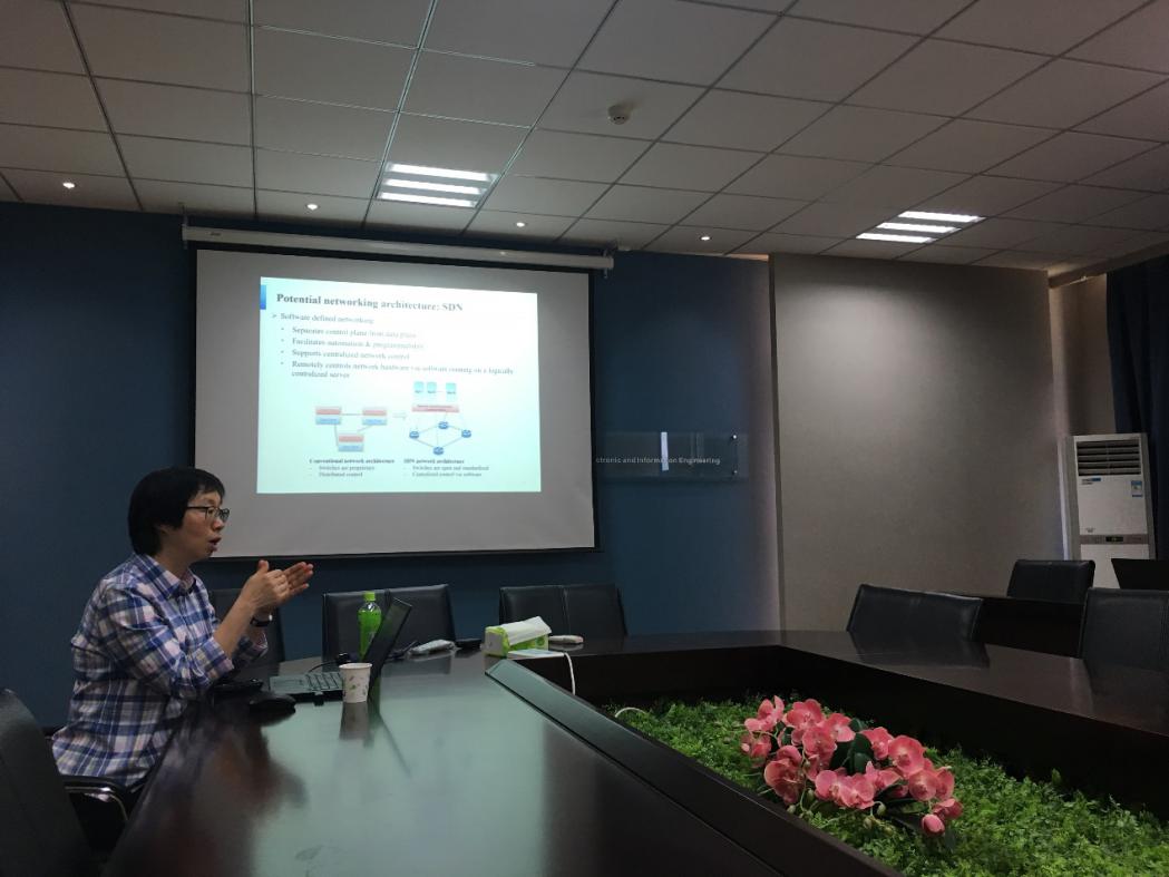 在交流过程中,吴启晖教授向庄卫华院士介绍了我院研究团队构成以及学术科研成果近况,并重点介绍了我院在无人机频谱监测、抗干扰频谱管控链、车联网智能频谱协作、大数据频谱态势预测、太赫兹成像、电磁频谱博弈对抗等方面的研究。随后,庄卫华院士做了题为《Service Provisioning in 5G Communication Networks》的学术报告,介绍了加拿大滑铁卢大学研究团队在5G核心网网络功能虚拟化、软件定义网络方面的近期研究进展及成果。报告结束后,在吴启晖教授的主持下,我院师生代表与庄卫华院士就报告内容及相关研究方向展开热烈的学术讨论。此后,我院常务副院长吴启晖、久久小说 国际合作处副处长沈敏、我院副院长刘伟强、我院黎宁副教授也与庄卫华院士就双方未来的国际学术交流与合作进行了深入探讨与交流。