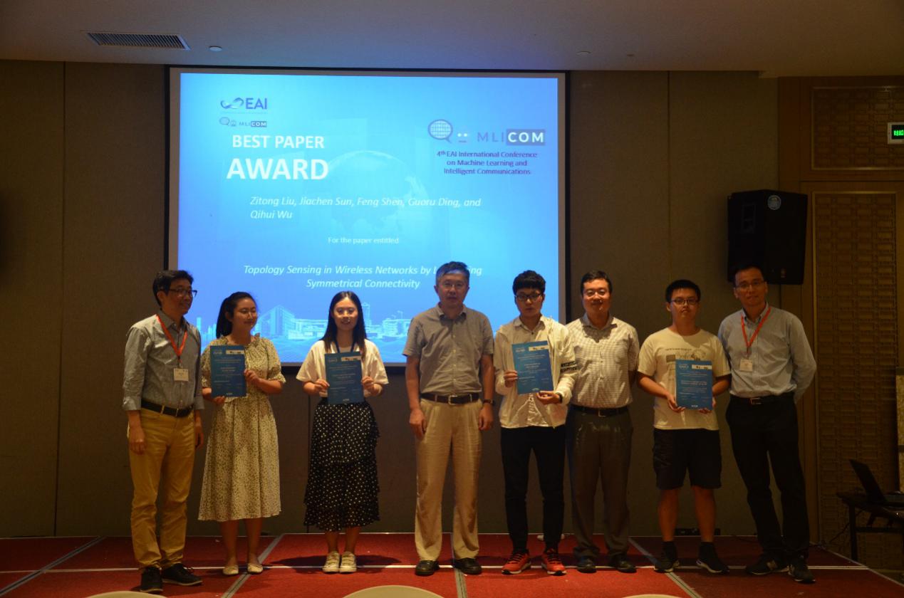 大会举办了Best Paper Award Ceremony,从会议的64篇论文中挑选出4篇作为Best Paper。刘子彤的论文“Topology Sensing in Wireless Networks by Leveraging Symmetrical Connectivity”获得MLICOM 2019 Best Paper。