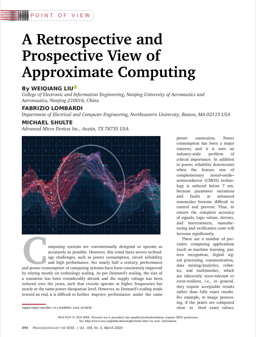 刘伟强副教授受邀与美国AMD公司的Michael Shuttle博士(AMD Senior Fellow)、美国东北大学的Fabrizio Lombardi教授(IEEE Fellow)在具有108年历史(创刊于1913年)的国际工程领域综合性顶级期刊《Proceedings of the IEEE》(影响因子:10.694)上组织了该期刊历史上首个关于近似计算器件、电路与系统的专辑“Approximate Computing”(图1)。并受邀发表了该期刊历史上首篇关于近似计算的观点性综述论文“A Retrospective and Prospective View of Approximate Computing”(图2)。这是久久小说