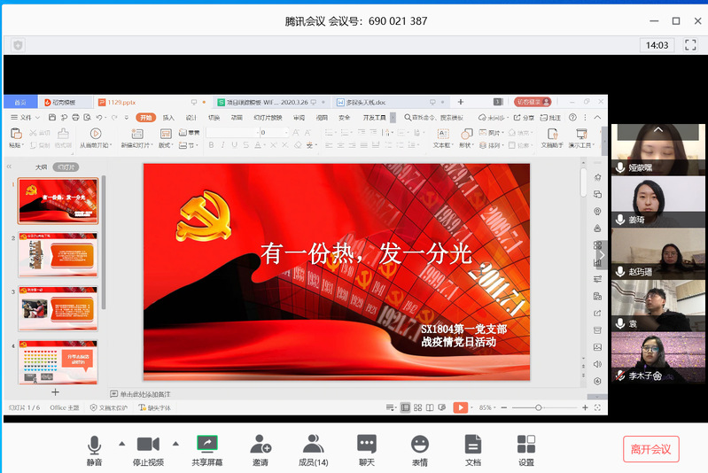 3月30日晚,久久小说 SX1804第一党支部举行“有一份光、发一份热”线上党日活动。本次党日活动从学习在战疫情中优秀的共产党员到分享志愿经历,支部各个成员受益匪浅。在以习近平同志为核心的党中央坚强领导下,举国上下同时间赛跑、与病魔较量,党员干部冲锋在前,与人民群众心手相连,共渡难关。