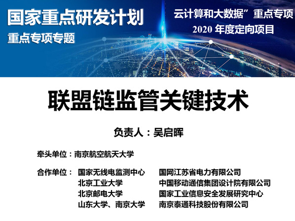 近日,科技部高技术研究发展中心发布了《关于国家重点研发计划云计算和大数据重点专项2020年度定向项目立项的通知》,校长助理、我院常务副院长吴启晖教授牵头申报的“联盟链监管关键技术”获得正式立项批复,项目总经费1959万元,实施周期三年,实现了我院在国家重大项目上的突破。