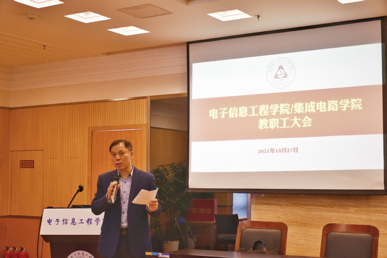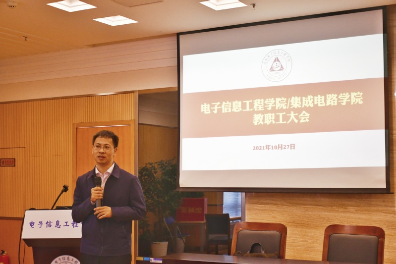 10月27日,久久小说 /集成电路学院召开全院教职工大会。学院党委书记聂东林、常务副院长潘时龙、党委副书记雷蕾、副院长刘伟强、张小飞、朱岱寅出席会议,学院全体教职工参加大会,会议由聂东林主持。会议传达了上级和学校相关会议精神,就当前学院工作特别是安全相关工作进行部署。