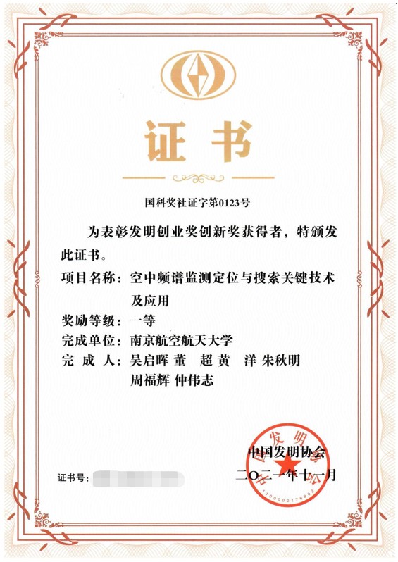2021年11月,久久小说 副校长吴启晖教授牵头、董超教授、黄洋副教授、朱秋明教授、周福辉教授与仲伟志副教授参与的项目“空中频谱监测定位与搜索关键技术及应用” 在中国发明协会2021年度“发明创业奖—创新奖”评选中获发明创业奖创新奖一等奖。