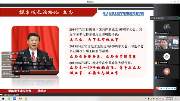 4月20日晚,我院开展首期慧通讲堂,慧通讲堂取名于学院院训“经纬天地,慧通时空”,旨在邀请各行各业专家教授与同学们话成长、谈奋斗、创未来。学院常务副院长潘时龙主讲了首期慧通讲堂,题为《青年学生成长思考》。讲堂由2020级本科生辅导员梅旭鹏主持,学院党委副书记雷蕾、团委书记席维唯、各年级辅导员及四百多名同学在线参加了此次讲堂,累计获得3.3w点赞。