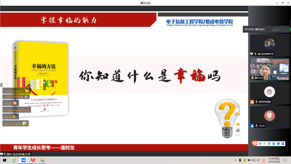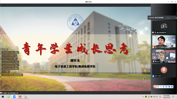 潘时龙围绕“幸福”和成长”两个主题,讲述当代青年获取幸福的能力、健康成长的方法。结合带领团队在科研过程中攻克困难的经历,用“励志、勤学、改过、择善”的路径解读成长的过程,在疫情之下,帮助青年学生形成对人生的正确态度,引领奋斗成长。