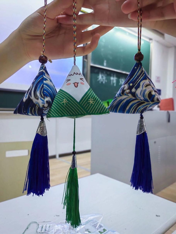 节日仪式感不可少,佩香囊,是端午传统习俗之一。手工DIY粽子形状的香囊,也不失对端午节的尊重。大家穿针引线,缝制出各式各样的香囊;并用将艾草填充,用彩绳串起一个个粽子形状的香囊。除此之外,亲手制作香囊的过程更是让同学们对端午这一传统节日及其传统风俗产生了探索之意,向往之情。