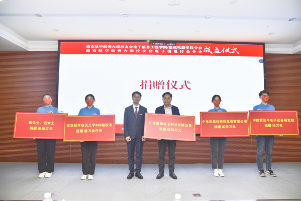 随后举行了捐赠仪式,潘时龙代表学院接受校友代表捐赠铭牌。杨先生、迟女士捐赠壹佰万元、江苏航泰电子科技有限公司捐赠柒拾万元、中电科思仪科技股份有限公司捐赠贰拾万元、南京航空航天大学486级校友捐赠拾万叁仟元、中航雷达与电子设备研究院捐赠拾万元。06级院友、省妇儿基金会副理事长王华,继续支持了“结伴前行专项计划”奖学金壹佰万元。