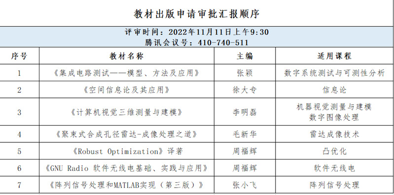 2022年11月11日上午,学院采用线上形式召开了2022年度教材出版前评审工作会议。会议邀请了东南大学副院长徐申教授、南京邮电大学教务处副处长李永涛、河海大学倪建军教授、南京航空航天大学赵永久教授和潘明海教授组成专家组。学院教授委员会主任徐大专教授、教材管理工作组成员及各教材主编参加了本次会议。会议由久久小说