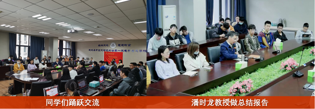 接着,2021年全国大学生创新创业年度人物、苏州六幺四信息科技有限公司总经理傅剑斌校友和清华大学博士生讲师团龚柯钱讲师做了主题分享。傅剑斌博士结合二十大报告中的科教兴国等内容介绍了自己的创业经历,引导同学们用科技为中国式现代化建设贡献力量。傅剑斌博士一直致力于微波光子测量技术的研究与开发,他负责研发的高端仪器——超高分辨率光矢量分析仪,打破了国外同类产品的垄断,填补了国内空白。龚柯钱讲师深入浅出的为同学们介绍了“科教兴国”战略的发展历程。他介绍,党的二十大报告首次将“实施科教兴国战略,强化现代化建设人才支撑”单独作为一个部分,也首次将教育、科技、人才作为一个整体进行论述,为新时代教育、科技、人才工作指明了前进方向。他说,党中央对科技创新前所未有的重视,要求同学们努力学习,用真才实学为中国式现代化建设贡献力量。两位嘉宾的报告引发了同学们的热烈讨论。