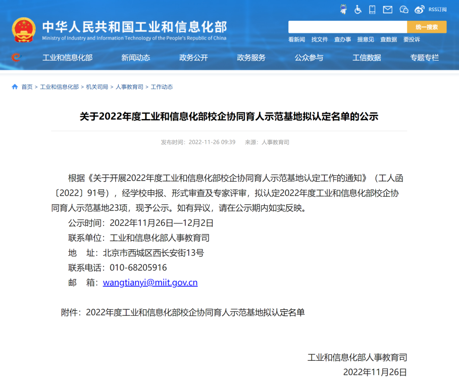 2022年11月26日,工业和信息化部人事教育司发布了《关于2022年度工业和信息化部校企协同育人示范基地拟认定名单的公示》通知。我院申报的南京航空航天大学-中国航空工业无线电电子研究所航空电子协同育人基地成功入选2022年度工业和信息化部校企协同育人示范基地。