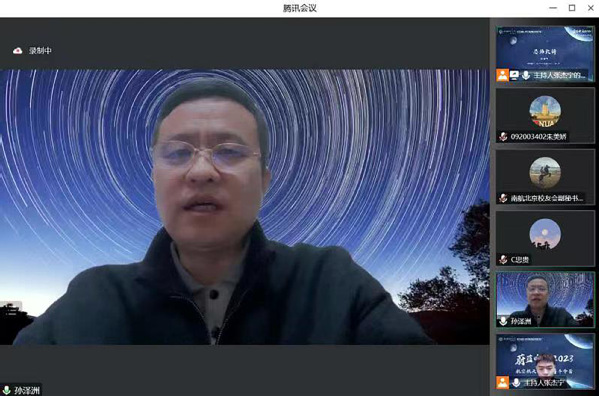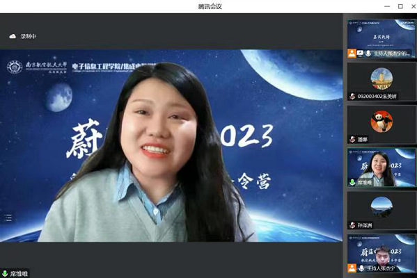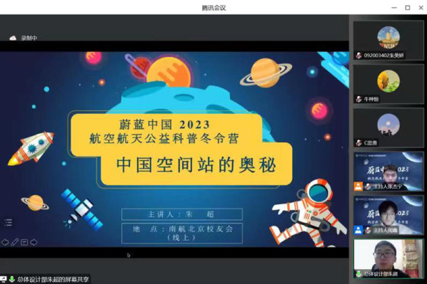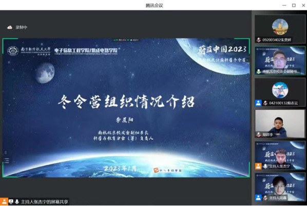 2023年1月14日晚,学院联合南航北京校友会校友之家、科普与教育分会(筹)共同开展的“蔚蓝中国2023”航空航天公益科普冬令营正式开营。南航北京校友会副会长、中国北斗三号卫星系统总设计师陈忠贵,嫦娥四号、天问一号探测器系统总设计师孙泽洲,航天五院中国空间站机械臂设计师朱超,南航北京校友会副秘书长、校友之家负责人潘娜,南航北京校友会副秘书长、科普与教育分会(筹)负责人李晨阳,南航久久小说 /集成电路学院团委书记席维唯出席活动并分别致辞。南京航空航天大学师生代表、校友及其子女,以及来自江苏、河南、贵州、江西等地学生约180人参加活动。