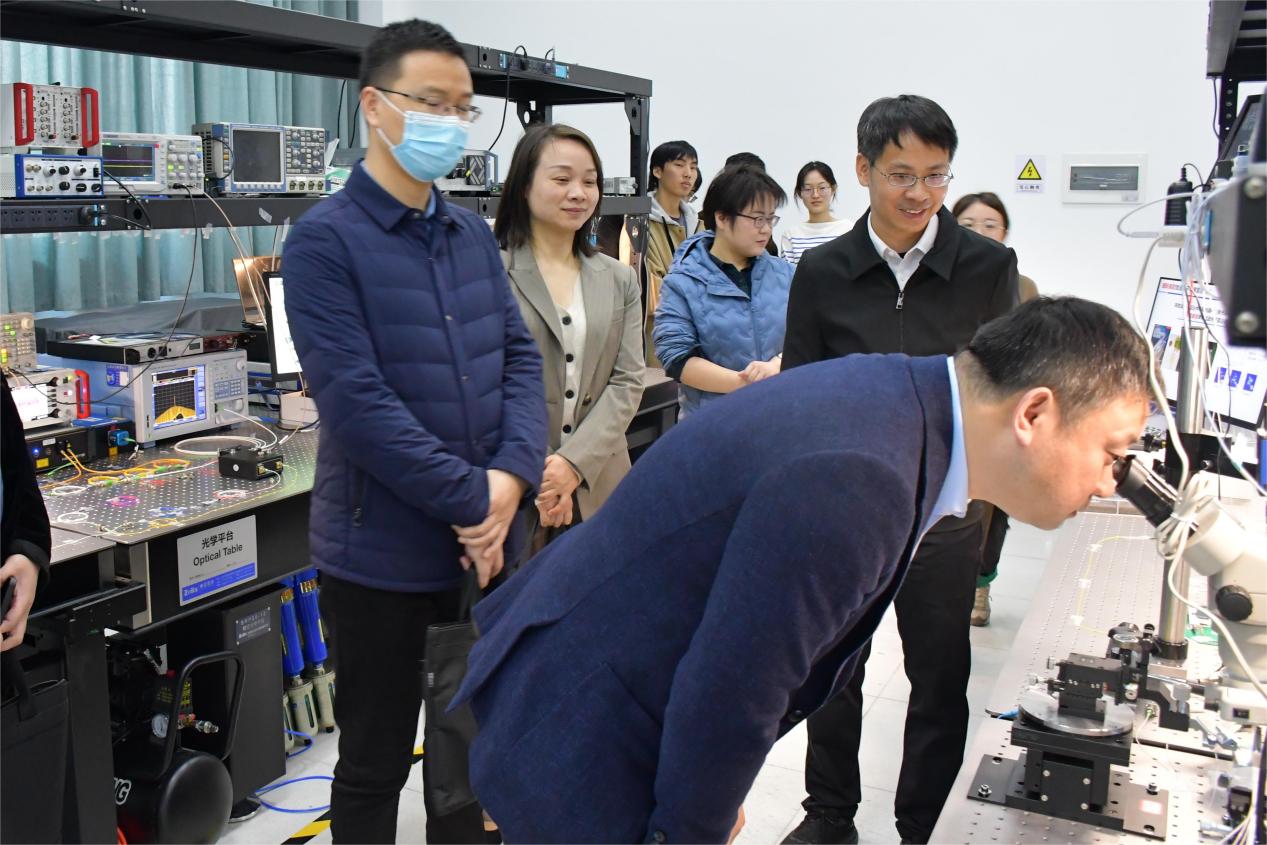 陆慧一行来到我院的微波光子技术国家级重点实验室参观科研设备和重点成果。我院常务副院长潘时龙介绍了微波光子技术国家级重点实验室的整体情况,展示了光矢量分析系列仪表、光生微波源、微波光子实时频谱测量仪、光载GNSS一机多天线系统、新型光子器件与芯片等成果。