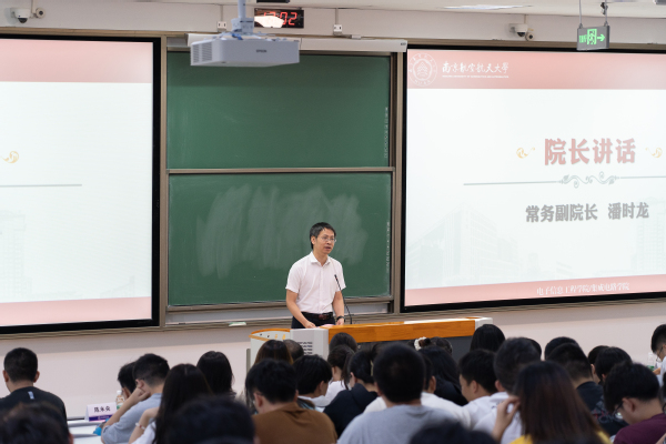 学院常务副院长潘时龙代表学院全体师生对345名研究生新生的到来表示热烈的欢迎,他结合二十大报告及习近平总书记江苏考察重要指示精神,勉励同学们要立志在电子信息领域有所作为。他向同学们提出了三点希冀,一是要志存高远,服务国家需求。二是要敢于突破,培养创新思维。三是要求索不止,锤炼奋斗精神,用实际行动将“经纬天地,慧通时空”的四院精神传承、发扬。他在致辞中以我院优秀博士毕业生张博文主动选择赴国防单位就业的故事为例,鼓励新生聚焦国家所需,着眼重大战略,把勇于创新,奋勇争先的精神内化于心,为科技强国注入澎湃的青春动能。