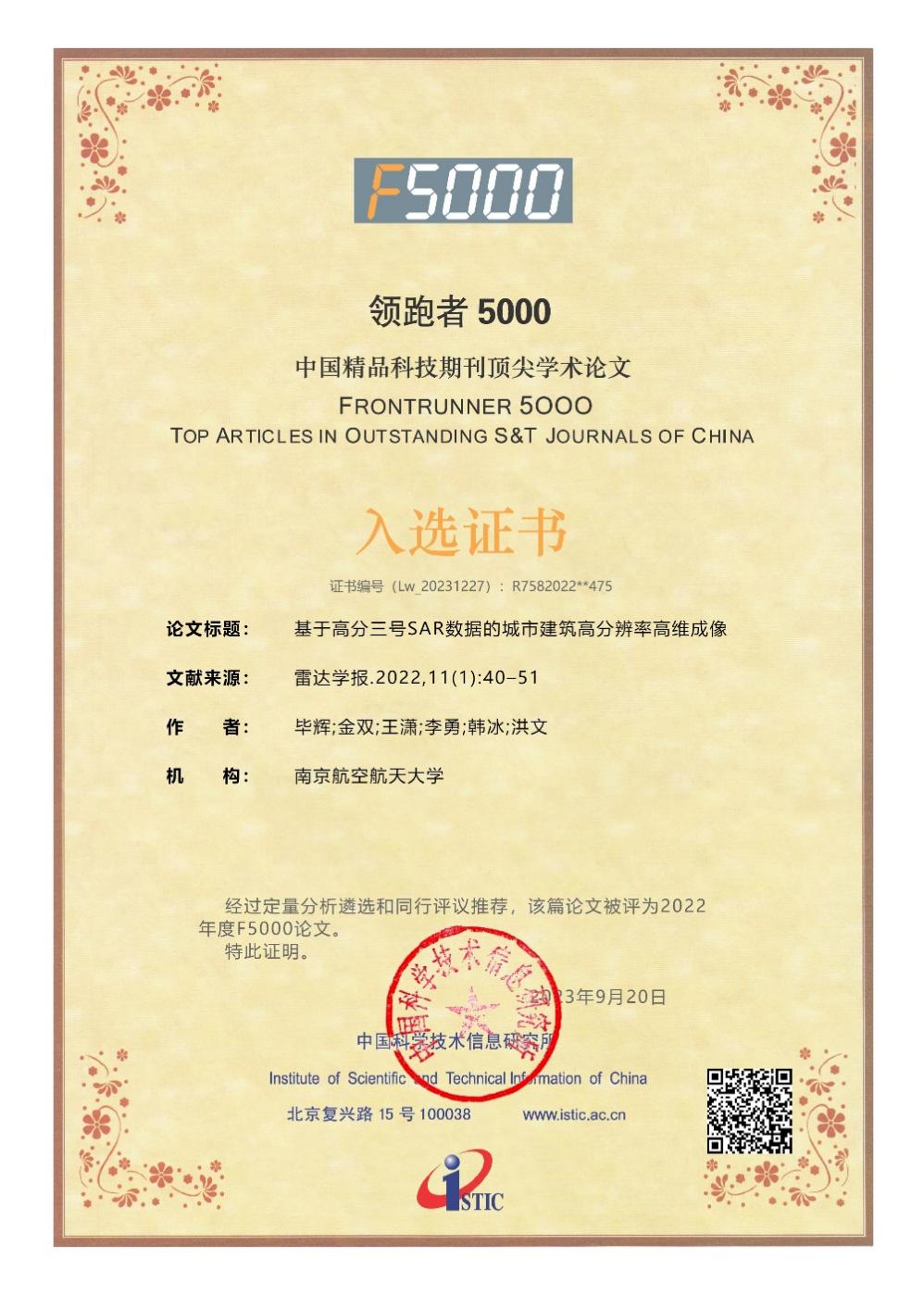 2023年9月20日,科技部中国科学技术信息研究所公布了2022年度“领跑者5000——中国精品科技期刊顶尖学术论文(Frontrunner 5000,简称F5000)”获奖名单,南京航空航天大学朱岱寅教授、毕辉教授课题组论文《基于高分三号SAR数据的城市建筑高分辨率高维成像》(雷达学报. 2022, 11(1): 40-51. 毕辉, 金双, 王潇, 李勇, 韩冰, 洪文.)荣获该奖项。