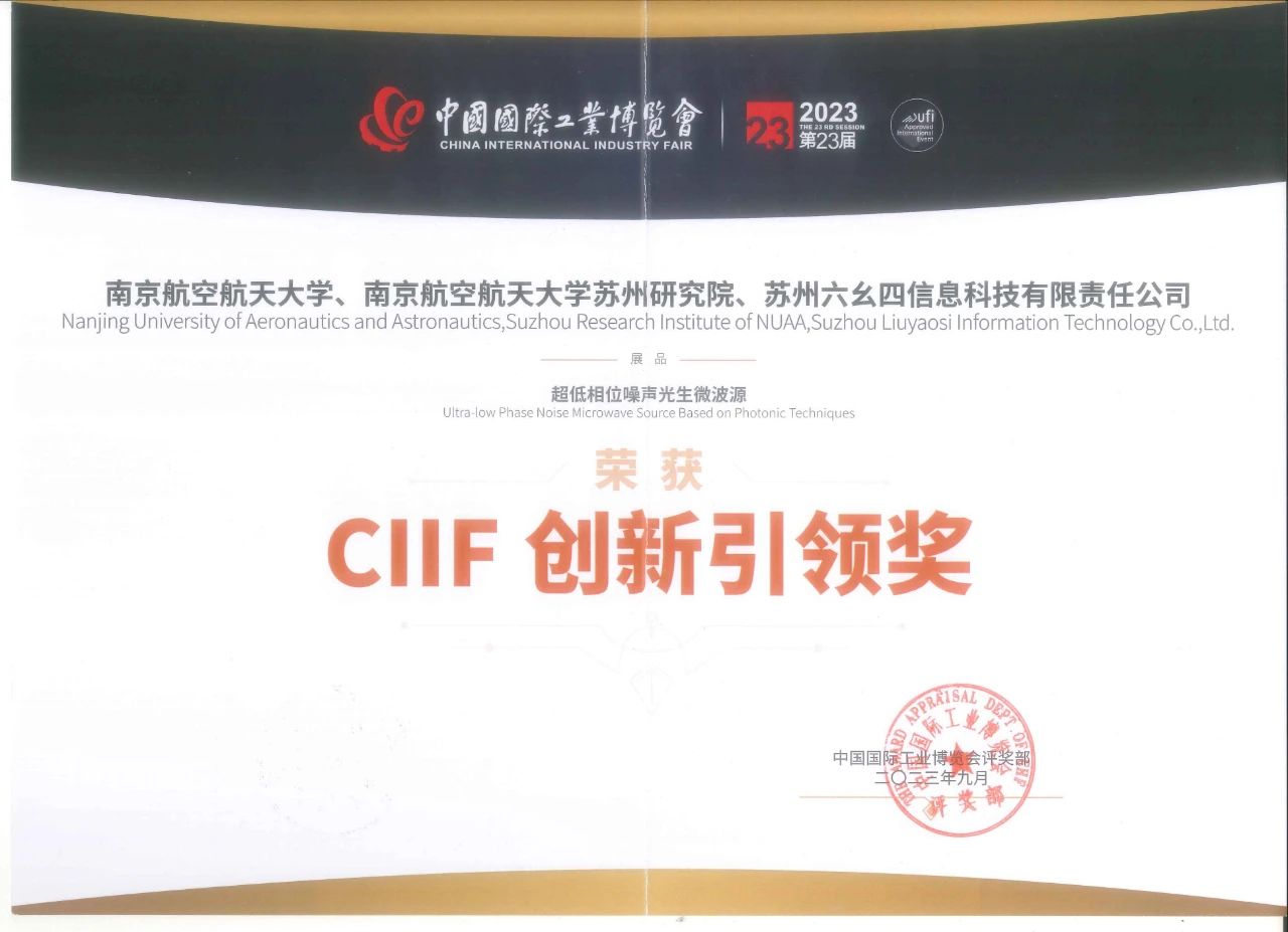 近日,天元实验室的创新研究成果——超低相位噪声光生微波源荣获2023年第23届中国国际工业博览会“CIIF创新引领奖”。“CIIF创新引领奖”为中国工博会的六大领域专项奖之一,评选奖项不超过10项。