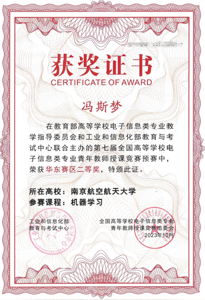 第七届全国高等学校电子信息类专业青年教师授课竞赛于2023年10月22日在桂林电子科技大学顺利结束。我院信息与通信技术系冯斯梦老师主讲课程《机器学习》获华东赛区二等奖,集成电路系周芳老师主讲课程《通信电子线路》获华东赛区三等奖。