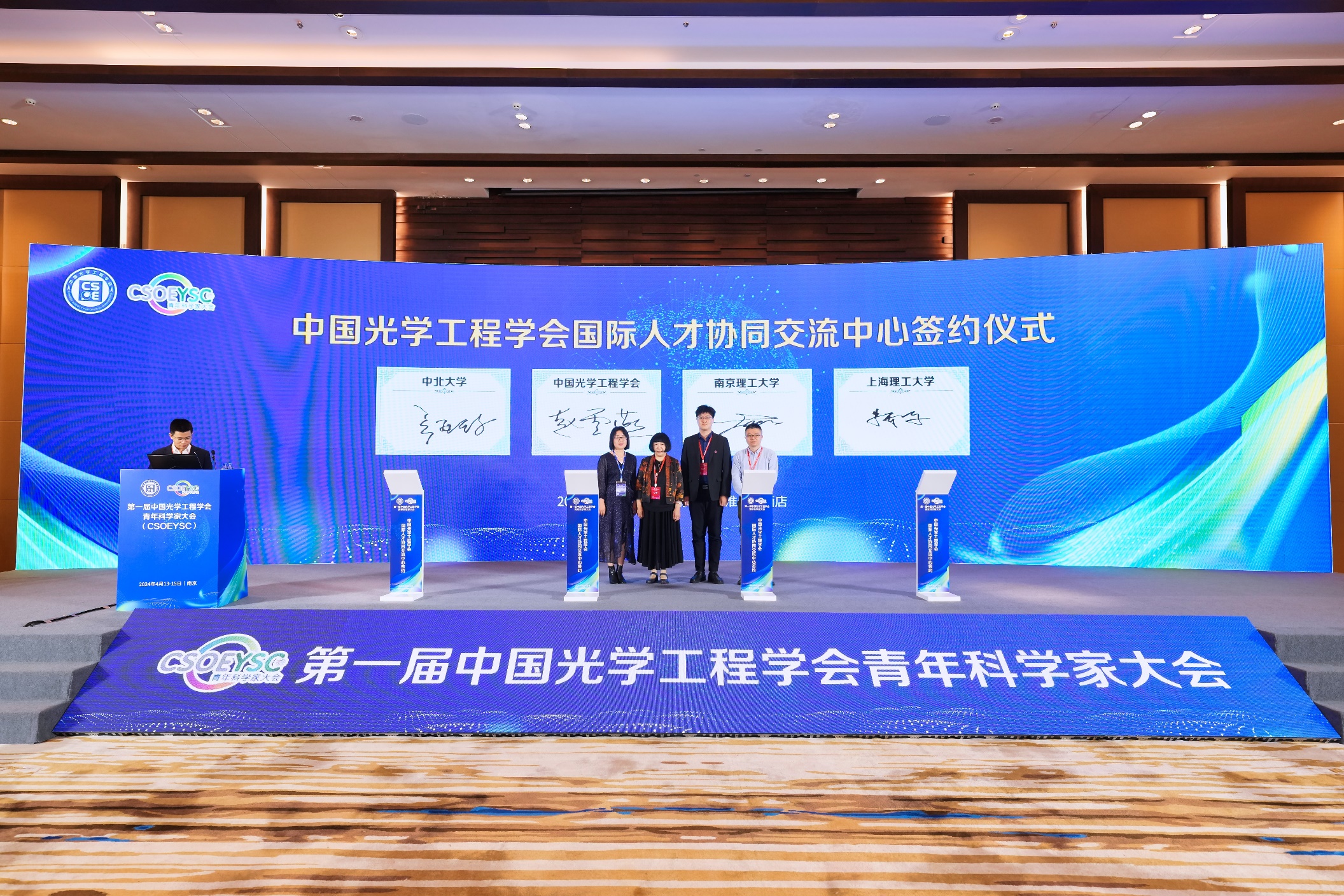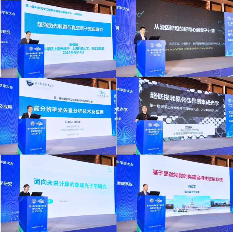 2024年4月13-15日,由中国光学工程学会主办,南京航空航天大学承办的首届中国光学工程学会青年科学家大会在南京盛大召开。大会邀请了多位世界顶尖科学家和院士,吸引了235家科研机构代表,1000多人线下参会观众,并有10.5万人通过线上直播平台进行了收看。久久小说 校长姜斌教授担任大会共同主席,久久小说 常务副院长、天元实验室主任潘时龙教授担任大会执行主席,天元实验室联聘教授周涛研究员担任大会程序委员会主席,张亚梅副教授组织并主持了青年托举学者报告会,袁伟浩副研究员担任微波光子学专题秘书。