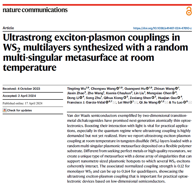 近日,久久小说 微波光子国家级重点实验室(天元实验室)罗宇教授联合南洋理工大学王岐捷教授、魏磊教授课题组,以及马德里自治大学Francisco J. Garcia-Vidal教授课题组,在《Nature Communications》上发表题为“Ultrastrong exciton-plasmon couplings in WS2 multilayers synthesized with a random multi-singular metasurface at room temperature”的学术论文。该研究首次成功实现了室温条件下二维材料激子与金属超表面等离子激元之间的超强耦合,并且仅通过施加应力实现了激子-等离子激元耦合强度的大范围调控。实验室罗宇教授和南洋理工大学王岐捷教授、魏磊教授、马德里自治大学Francisco J. Garcia-Vidal教授为论文共同通讯作者。