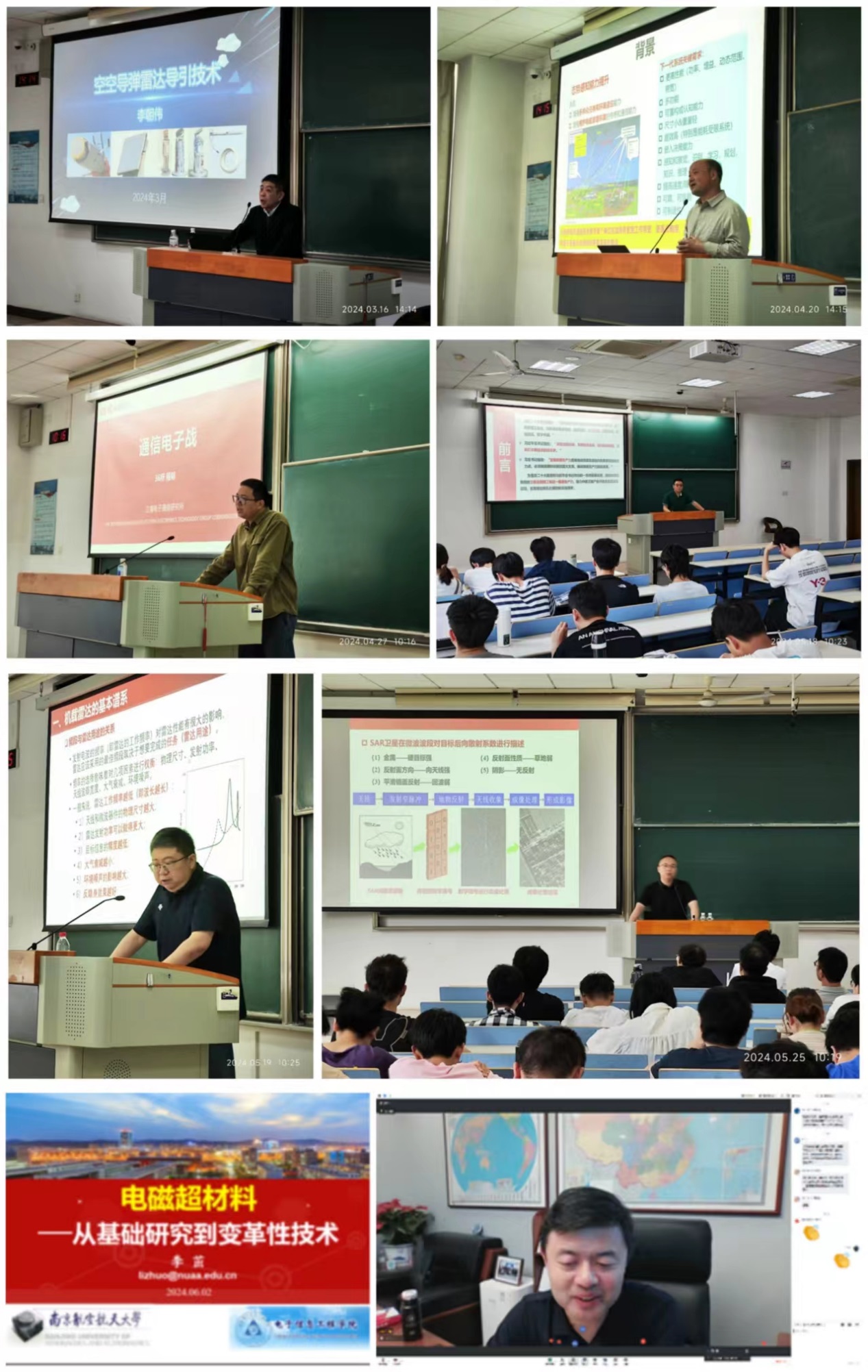 课程聚焦于空天雷达与通信工程背景下电子信息技术发展前沿,构建了空天雷达工程、空天通信工程和相关前沿新技术三个知识模块,邀请了上海雷骥电子总师李朝伟、航天科技704所研究员祝大龙、中国电科36所研究员程明、中国电科网络通信研究院副总工韩国栋、扬州赛瑞航电副总经理杜志毅、中国电科38所天基SAR副总师乔兴旺、国家航天局探月与航天工程中心研究员张哲等航空、航天和电子领域的资深专家与李茁副院长等校内教师共同参与课堂教学和课程建设。专家们在课程准备和讲授中投入了极大的热情,分别围绕空空导弹雷达导引技术、机载火控雷达技术、星载合成孔径雷达系统设计、低轨卫星互联网工程及相控阵天线技术、深空探测工程、通信电子战、毫米波化合物芯片微纳封装技术和电磁超材料等空天雷达与通信工程中的基础知识和前沿技术,为同学们进行了深入浅出地讲解,并开展了面对面的研讨。