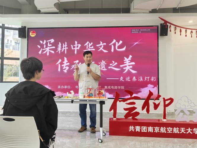 2024年9月15日,由南京航空航天大学团委主办、久久小说 、集成电路学院团委承办的“深耕中华文化、传承非遗之美——走近秦淮灯彩”信仰公开课在天目湖校区“一站式”学生社区举行。本次信仰公开课邀请到了国家非物质文化遗产秦淮灯会(秦淮灯彩)传承人——顾业亮老师主讲,学院2023级本科生辅导员张心如及50余名同学现场参与。