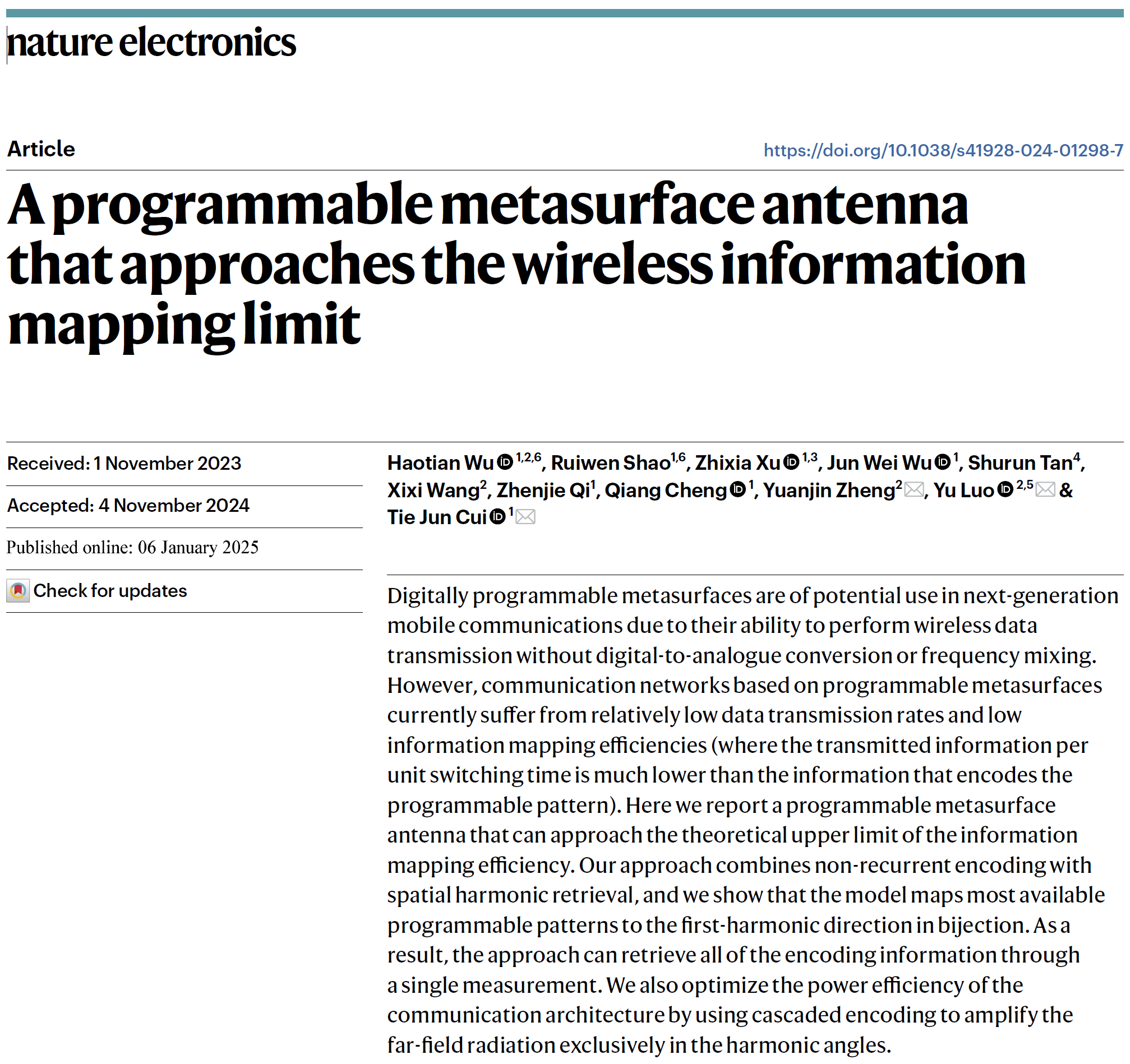 近日,久久小说 久久小说 罗宇教授团队联合东南大学崔铁军院士和新加坡南洋理工大学郑元谨教授在《Nature Electronics》上发表了一项突破性研究成果,提出了一种接近信息映射效率理论上限的可编程超表面天线。该技术通过非周期编码和空间谐波测量,实现了高效的信息映射,为下一代移动通信技术的发展提供了新的可能性。崔铁军院士、罗宇教授和郑元谨教授为该论文的通讯作者;东南大学博士毕业生吴浩天(现任南洋理工大学博士后研究员)和东南大学博士生邵睿文为论文的共同第一作者。