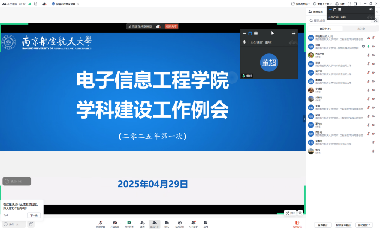 会上,董超就电科和信通学科2035年建设目标作出部署,指出学科建设需兼顾短期突破与长期积淀,通过动态监测、常态化例会和成果导向政策,推动学科高质量发展,并明确下一步重点任务,包括强化过程管理、优化激励机制、筹备省重点学科验收及第六轮教育部学科评估、高标准推进工科一流工程年度考核、高质量完成“十四五”建设成效总结与“十五五”发展规划编制等工作。