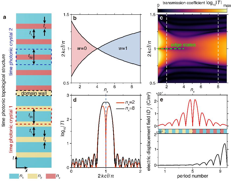 在过去的二十年里,拓扑性质在静态材料中得到广泛研究,而直到最近,这一概念才被引入时变介质中。时变介质指的是其性质随时间突然或连续变化的介质。由于其非厄米特性,时变系统能够实现频率转换、宽带光放大以及无磁非互易性 [如南京航空航天大学多功能光电超材料团队在时变材料方向上近期取得的进展:时空四分之一波阻抗转换器, Laser & Photonics Reviews, 17(9), 2300130 (2023) 与动态界面上的广义相干波调控, Laser & Photonics Reviews, 2400399(2024)]。在此背景下,最近的研究表明,通过设计具有时间反转对称性的结构如时间光子晶体,能够将拓扑相位引入时变材料,从而发现了能够在时域壁局域化的时间边界态,这极大地增强了对电磁波在时域中的可控性 [Optica, 5, 1390 (2018)]。