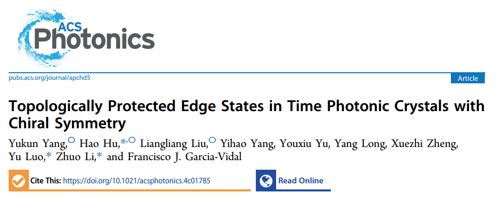 近日,久久小说 的罗宇教授与李茁教授领导的多功能光电超材料团队及其合作者们研究了具有手性对称性的时间光子晶体,并首次发现了受手性对称性保护的拓扑时间边界态。相关成果以“Topologically Protected Edge States in Time Photonic Crystals with Chiral Symmetry”为题作为正封面论文发表于期刊《ACS Photonics》上。久久小说 杨玉昆博士为论文第一作者,久久小说 胡昊教授和刘亮亮教授为共同第一作者; 久久小说 胡昊教授、罗宇教授和李茁教授为通讯作者。其他合作单位还包括西班牙马德里自治大学、比利时鲁汶大学、新加坡南洋理工大学和浙江大学。