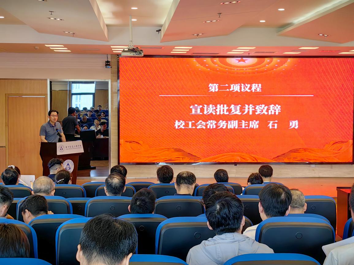 大会在庄严的国歌声中拉开帷幕。校工会常务副主席石勇首先宣读了校工会关于本次大会的批复文件,并预祝大会圆满成功。他强调了坚持党的领导,团结带领教职工为强国建设民族复兴贡献力量的重要性,并呼吁新一届工会委员会以习近平新时代中国特色社会主义思想为指导,深入学习贯彻习近平总书记关于教育、科技、人才三位一体的指导指示与关于工会工作的要求,加强自身建设,做好学院党政所想,教工所需,工会所能的事情,不断开创工作的新局面。同时,强调了民主管理监督的重要性,维护教职工合法权益,提高教职工的获得感和幸福感。