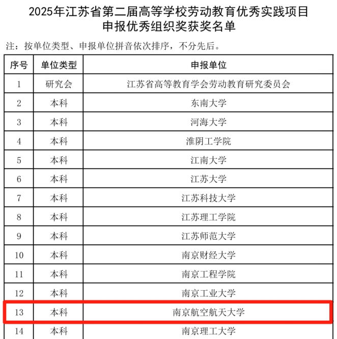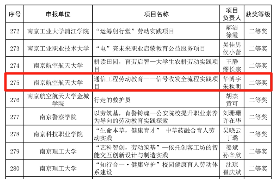 近日,江苏省高等教育学会公布了2025 年江苏省第二届高等学校劳动教育优秀实践项目评选结果。南京航空航天大学荣获 “优秀组织奖”,全校共斩获4项优秀实践项目奖项。其中,学院华博宇老师牵头组织教师申报的“通信工程劳动教育——信号收发全流程实践项目”成功获评二等奖,该项目聚焦通信工程领域的劳动教育实践,通过信号收发全流程的实操环节,有效提升了学生的劳动技能与专业素养。