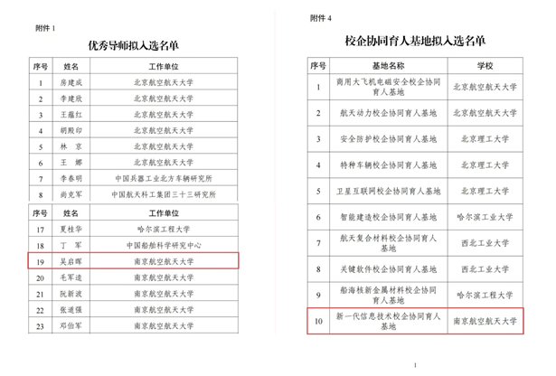 近日,工信部公布了2025年度工程硕博士培养“五个100”计划有关项目获奖名单。我院吴启晖教授入选优秀导师、 南京航空航天大学-南京江宁高新工业园—“新一代信息技术”校企协同育人示范基地入选校企协同育人基地。