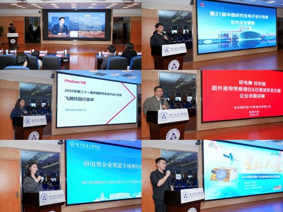 华为技术有限公司终端射频器件技术专家苏帅、蓝牙&星闪技术专家曹聪,飞腾信息技术有限公司高级技术赋能工程师刘晶晶,优利德科技(中国)股份有限公司江苏区销售经理陶金,烟台睿创微纳技术股份有限公司人力资源经理郝雪,分别结合企业核心技术与行业发展趋势,对各企业专项赛道进行细致讲解,助力同学们明晰赛道方向、精准把握产业技术前沿。在“研电之星”风采展示环节,学生焦柯源结合自身参赛经历,分享了备赛心得与竞赛成果,为在场学子提供了宝贵的经验参考。